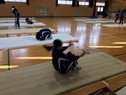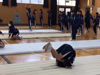 女子は体育館でマット運動、前転・後転です。前回り、後ろ回りですね。みんな、それなりにきっちりとできています。マスクでの運動は、ちょっとしんどいかなと思いましたが、みんな平気でした。