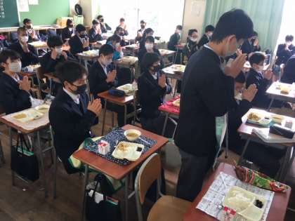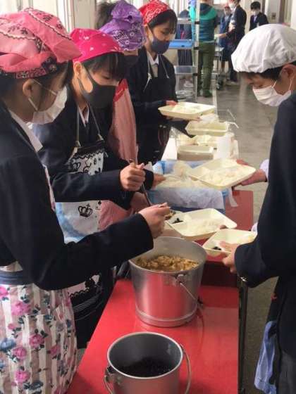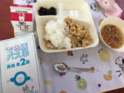 今日の給食献立は、親子丼・黒豆の煮物・すまし汁・牛乳です。
