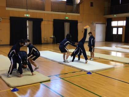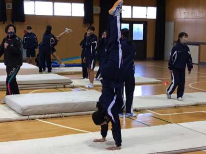 女子は体育館でマット運動です。倒立と倒立からの前転です。助け合いながら、支え合いながら、段々とできるようになっていきます。