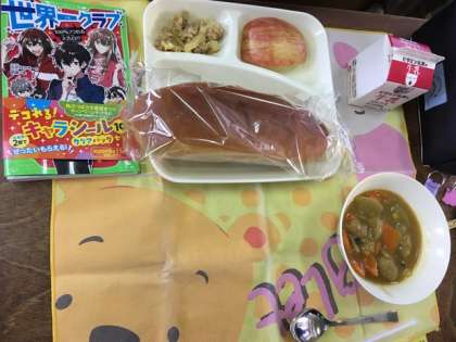 今日の給食献立は、黒糖パン・ミートボールと野菜のカレー煮・ツナとキャベツのソテー・りんご・牛乳です。