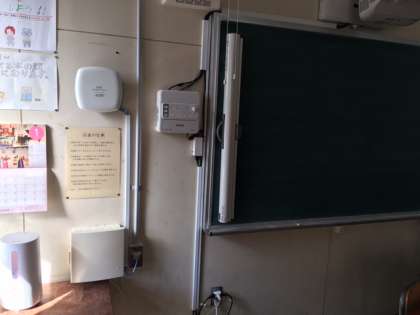 ちなみに、写真の黒板の左の設置物は、プロジェクターとそのリモコンとスクリーンです。スクリーンは右へ引き延ばして使用します。