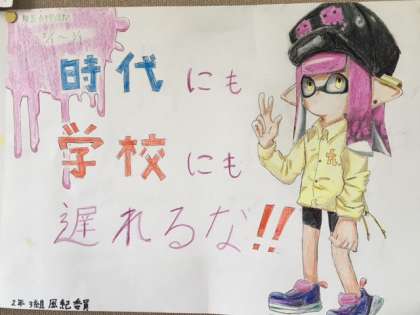 今週は、遅刻防止・服装点検週間です。生徒会の風紀委員会が写真のようなポスターを作って貼ってくれています。
