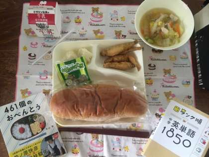 今日の給食献立は、黒糖パン・わかさぎのフライ・カリフラワーのサラダ・白菜のスープ・抹茶大豆・牛乳です。