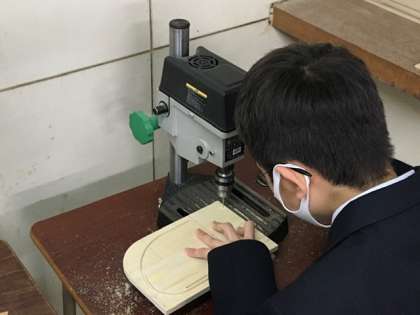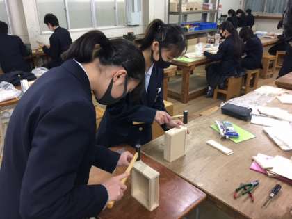 1年生の技術の授業です。「引き出し付きスライドBox」を制作しています。