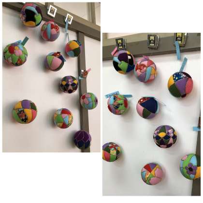 3年生の美術の授業で取り組んだ木目込み毬の作品です。鑑賞学習で学んだ日本の伝統工芸を実際に実践しようと始めました。