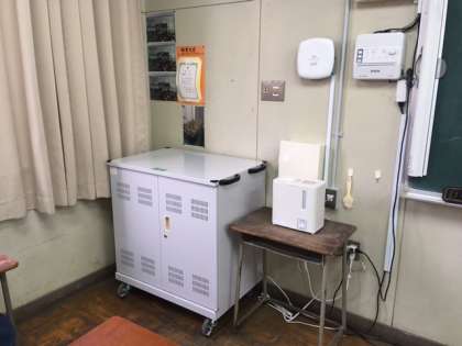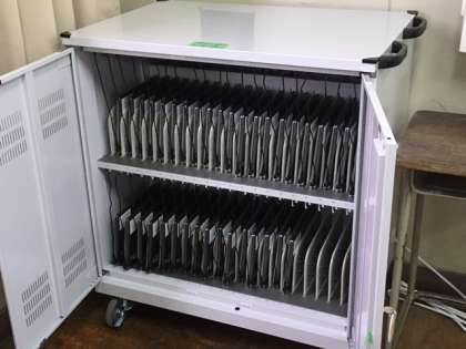 小型のノートパソコンですが、重量は結構あります。写真のように、各教室に配置されて、充電用保管庫に納められています。家庭での充電用ケーブルはついていないので、今のところは学校でのみ使用できるようです。