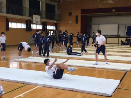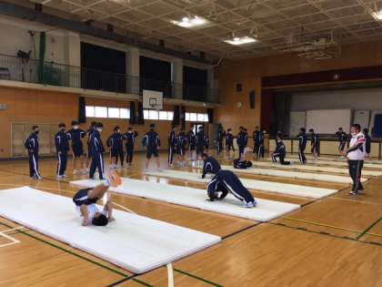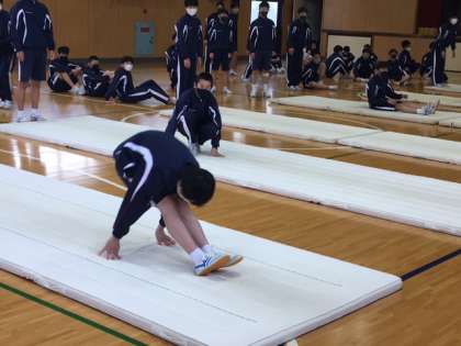 男子体育、マット運動をしています。