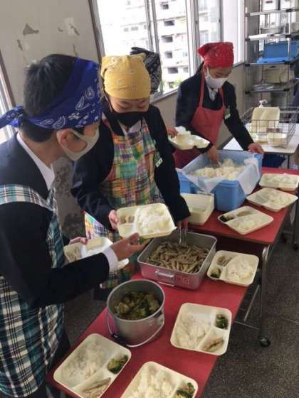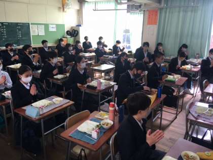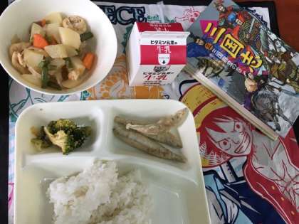 今日の給食献立は、ごはん・きびなご天ぷら・一口がんもとじゃがいもの煮物・ブロッコリーの胡麻和え・牛乳です。