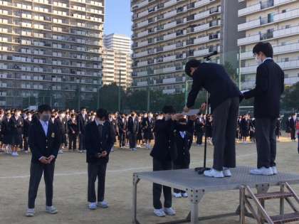 生徒会役員から、「ベルマーク運動」の表彰がありました。生徒会活動として、文化委員会が一年中、各クラスでベルマークを集めてくれています。今年度は6月の学校休業明けから、例年のような軌道に乗るまで時間がかかりましたが、この半年でずいぶんと集めてくれました。