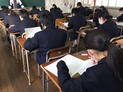 ピリッとした緊張感の中、全員が真剣な表情でテストに取り組んでいます。