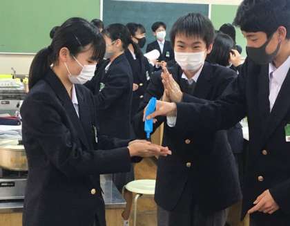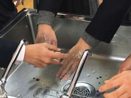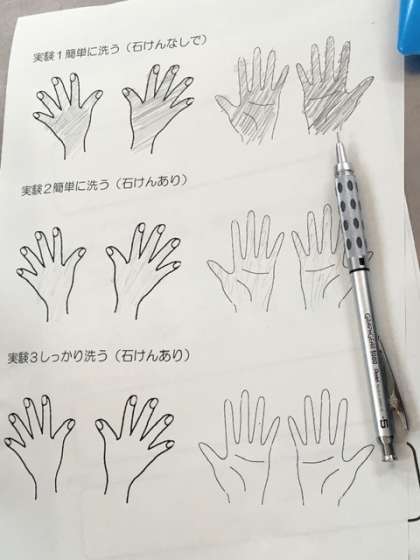 コロナ禍で、毎日、マスクと手洗いを続けている日々ですが、毎回、本当にきれいに洗えているのかどうか、家庭科の授業で実験をしてみました。