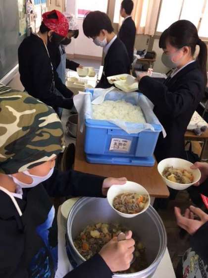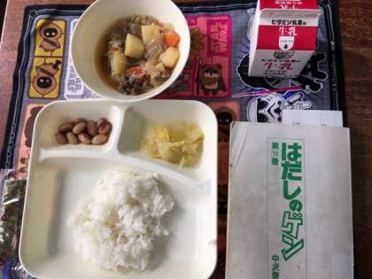今日の給食献立は、ごはん・肉じゃが・白菜のゆず風味・とら豆の煮物・焼き海苔・牛乳です。