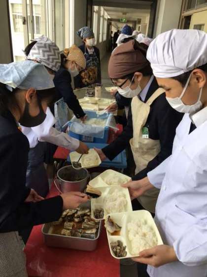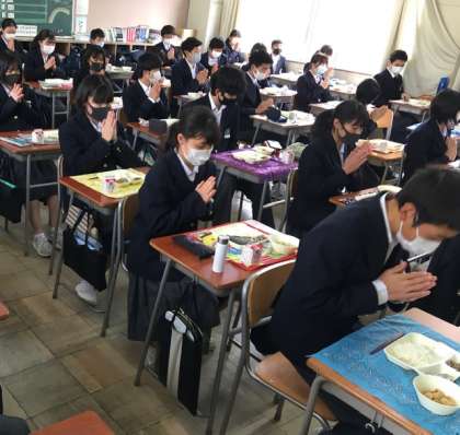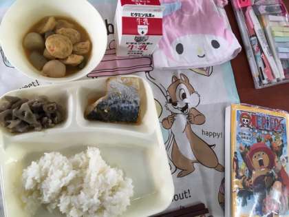 今日の給食献立は、ご飯・さごしのおろし醤油かけ・一口がんもと里芋の味噌煮・蓮根の炒め物・牛乳です。