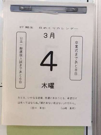 職員室の入り口の横に、「37期成 日めくりカレンダー」が貼られています。