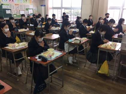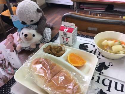 今日の給食献立は、おさつパン・鶏肉の味噌バターソース・野菜のスープ煮・デコポン・牛乳です。