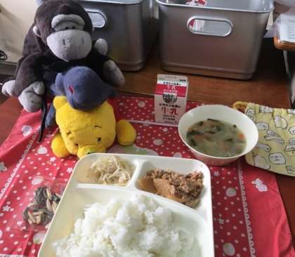 今日の給食献立は、ごはん・豚肉のコチジャン炒め・もやしのナムル・トック・アーモンドフィッシュ・牛乳です。