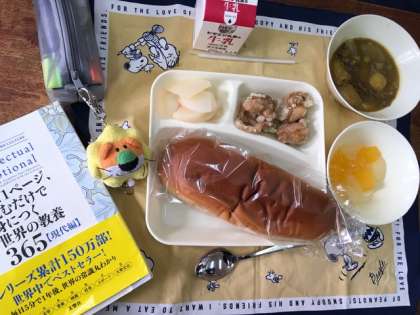 黒糖パン・フライドチキン・近江牛のカレーシチュー・お祝いピクルス・フルーツゼリー・牛乳です。