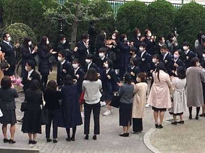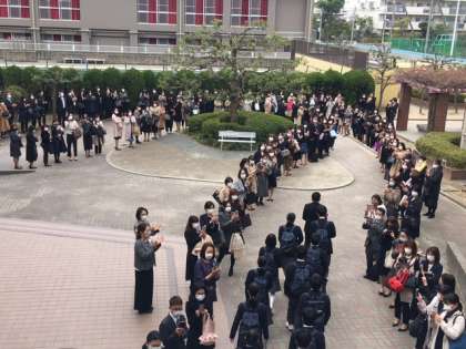 最後の学活を終えて、中庭から玄関ピロティに保護者の皆さんと教職員で花道を作って送り出しました。