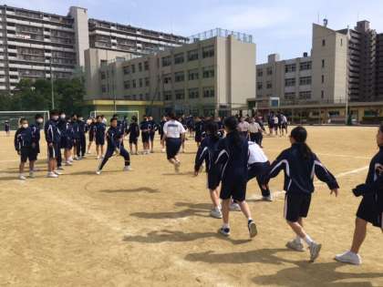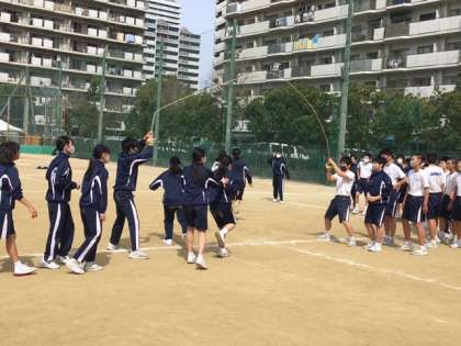 当然、苦手な生徒もいます。何度も挑戦して、ようやく跳べた時、友だちと抱き合って泣いて喜んでいました。渦巻く感動〜!!
