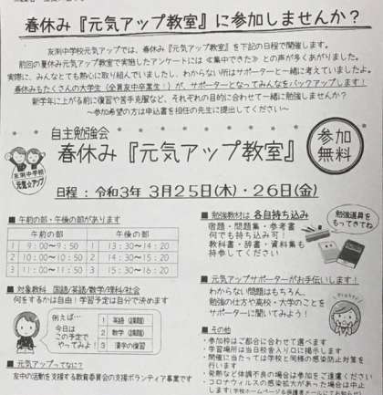 終業式の翌日・翌々日です。3月25日(木)・26日(金)朝から夕方までやってます。