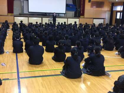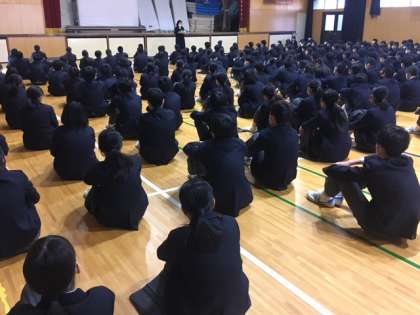 1・2時間めに体育館で、1年生と2年生がテレコで休暇前指導をしました。