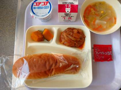 コッぺパン 煮込みハンバーグ コーンスープ 焼きかぼちゃ