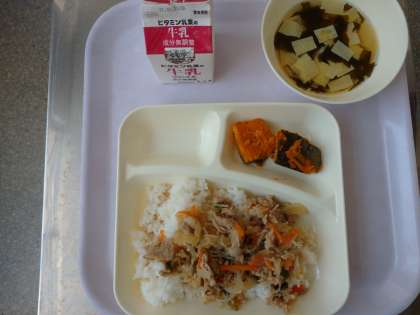 豚丼 湯葉のすまし汁 かぼちゃののしょうゆ焼き 牛乳  です。