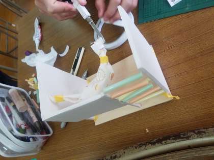自分の以外の誰かを想定し、その人が生活の中で使いやすい道具のデザインを美術科の観点から考えて、その模型を作りました。当然、素材も設定し、色や形をデザインすることで使いやすかったり、気分が上がったりするように考えました。
