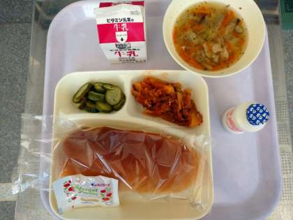 きゅうりのバジル風味サラダ 発酵乳 りんごジャム 牛乳  です。