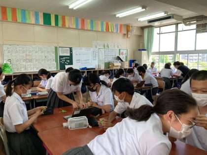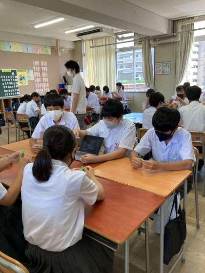 6月9日2年生は総合の時間を使って「コロナによる差別や偏見に反対し、コロナ感染にり患した人達を「ただいま、おかえり」という励ましを送る。」という趣旨のもとに、緑の紐で叶結びをするシトラスリボンを作成しました。