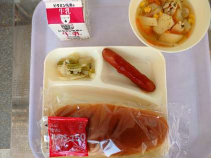 スープ キャベツとさんどまめのサラダ いちごジャム 牛乳 です。
