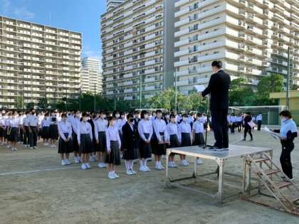 18日(月)、先週までの汗ばむ陽気から一気に秋らしい気温となり、グラウンドで《全校集会》が行われました。