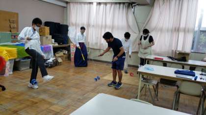 中国の伝統的な遊びを実演しています。学年の先生にも出演していただき、楽しい動画撮影になりました。