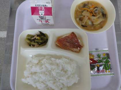 こまつなのいためもの 豆こんぶ 牛乳 です。