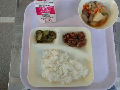 きゅうりの赤じそあえ みかん 牛乳  です。