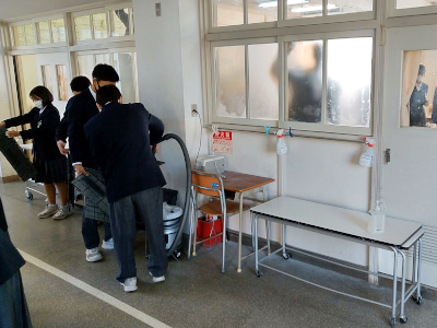 窓、扉、壁、腰板を雑巾がけ、・・・廊下はモップ掛け・・・すっかりきれいになりました。