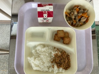 鶏肉とじゃがいもの煮もの あつあげのしょうゆだれかけ 紅ざけそぼろ ごはん