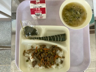本日の給食の献立は、 きんぴらちらし すまし汁 ちまき きざみのり 牛乳 です。