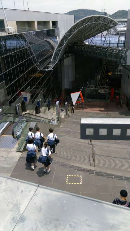 京都駅の天空の広場への階段を疲れ果てた姿で 降りていく班員たち がんばれー