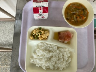あかうおのしょうゆだれかけ みそ汁 えんどうの卵とじ