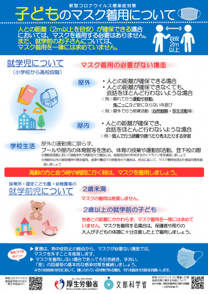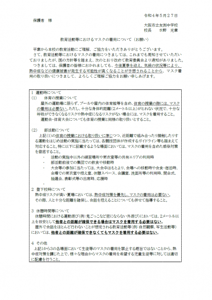 本日、子どもたちに「教育活動等におけるマスクの着用について(お願い)」のプリントを配布しました。どうぞ、ご覧いただきますようお願いいたします。学校ホームページにも掲載しておりますので、ご覧いただけます。