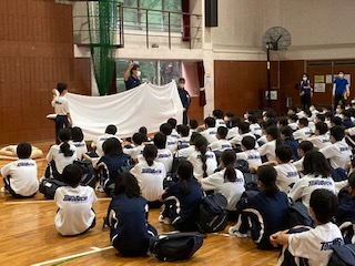 施設の方からのお話のあと、子どもたちも手伝ってシーツの使い方を学びました。