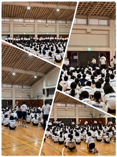 伝言ゲームや○×ゲーム、教員ダンスを行いました。