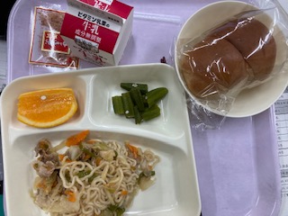 本日の給食の献立は、 和風焼きそば オクラの甘酢あえ オレンジ パン 牛乳 です。