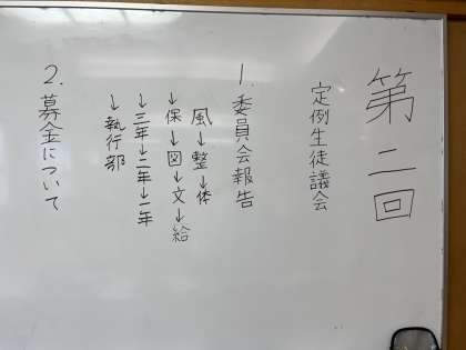 1か月間の各委員会の活動報告および生徒会主催の募金活動に関する説明を行いました。