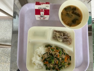 豚ひき肉とにらのそぼろ丼 みそ汁 キャベツの赤じそあえ 牛乳