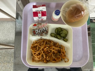 スパゲッティミートソース きゅうりのピクルス アーモンドフィッシュ