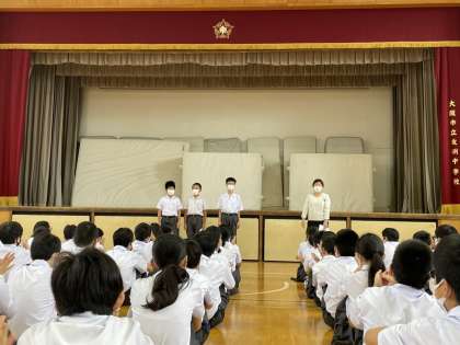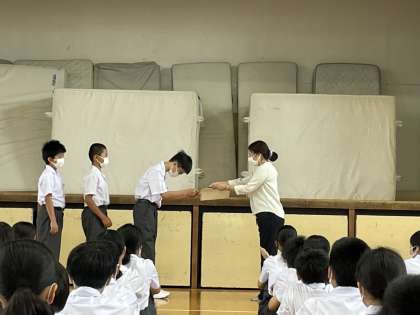 緑学年の先輩でもある教育実習の先生からのお話の後、一泊移住で行った山登りの表彰式を行いました。