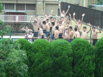 遠く離れた校舎から、雨の中の水泳授業の写真を撮っていると