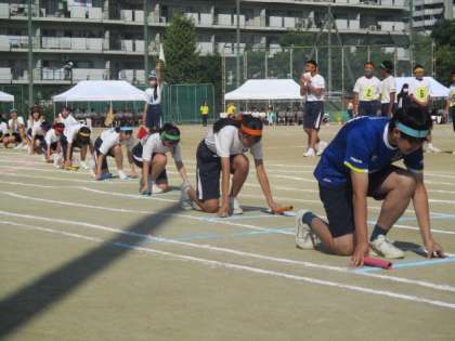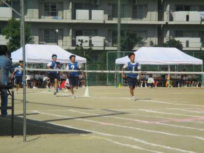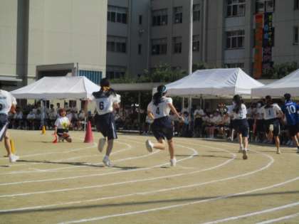 男女混合リレーの様子です。3年生のレースでは、3年生の先生も走りました。